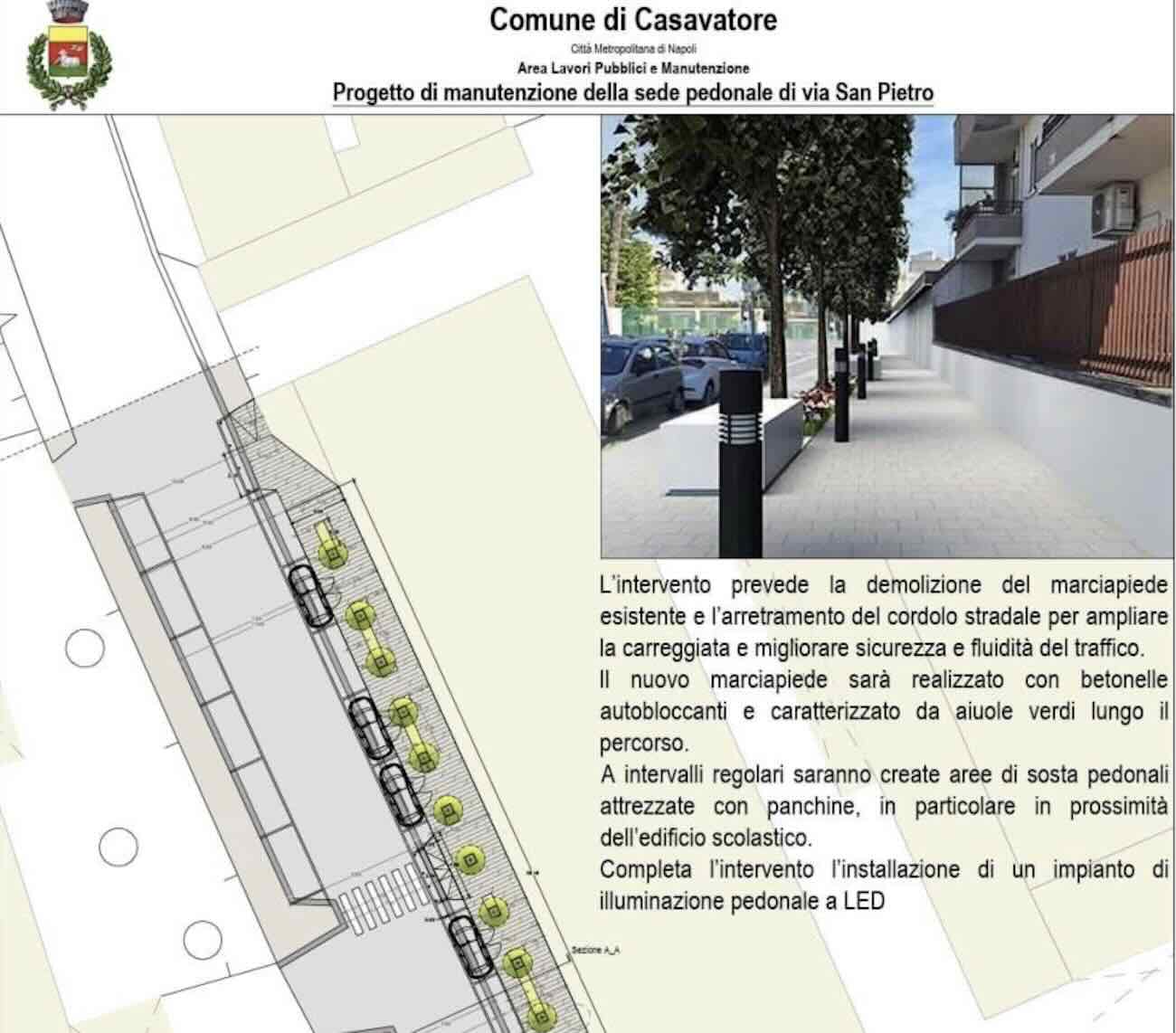 Casavatore – Redevelopment work has begun on Via San Pietro, in the area in front of the N. Romeo and A. De Curtis school buildings. This is a significant project, as explained by Mayor Fabrizio Celaj, which is part of a broader urban improvement program, completing the redevelopment of an area already affected by work begun on the corner of Via Palizzi.